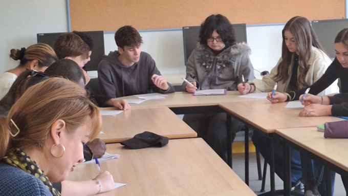 35 élèves de premiere HGGSP de V. Bordois, 15 personnes migrantes ( Maroc, Russie, Madagascar, Ukraine, Algérie...) en apprentissage de la culture française :